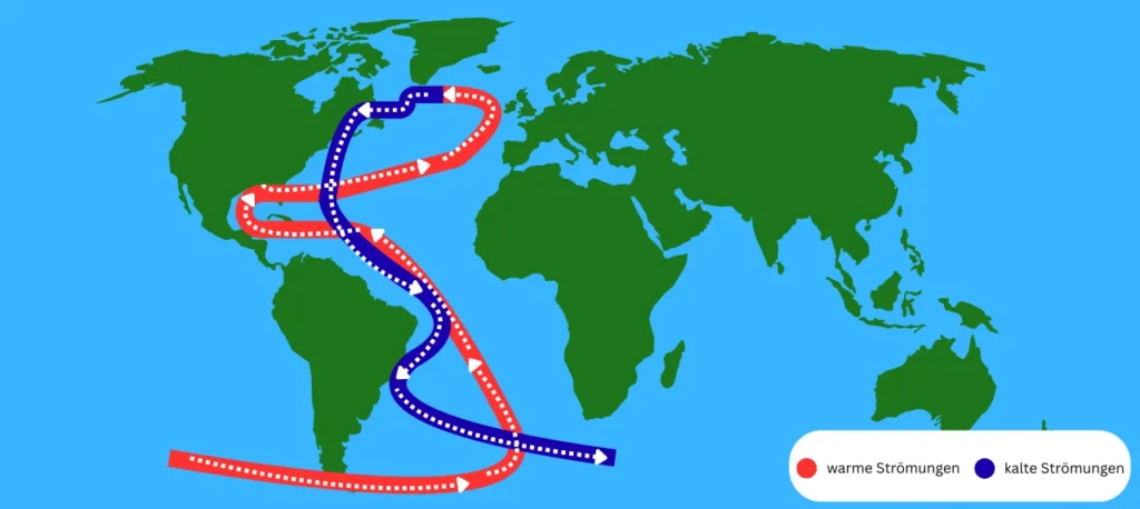 Der warme Golfstrom und der Nordatlantikstrom transportieren tropisches Wasser nach Nordeuropa und sorgen für milde Winter. Aus dem Arktischen Ozean fließt der kalte Labradorstrom nach Süden.