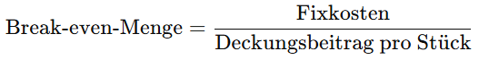 Um den Break-even-Point zu berechnen, brauchst du zuerst den Deckungsbeitrag, also den Betrag, den jedes Produkt zur Deckung der Fixkosten leistet. Anschließend werden die Fixkosten und der Deckungsbeitrag pro Stück genutzt, um zu bestimmen, ab welcher Absatzmenge die Gesamtkosten gedeckt sind.
