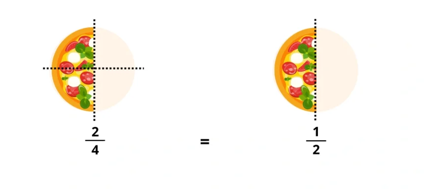 Zwar hat sich an der Menge des Kuchens nichts geändert. Trotzdem werden zwei verschiedene Brüche verwendet, die beide dasselbe meinen.