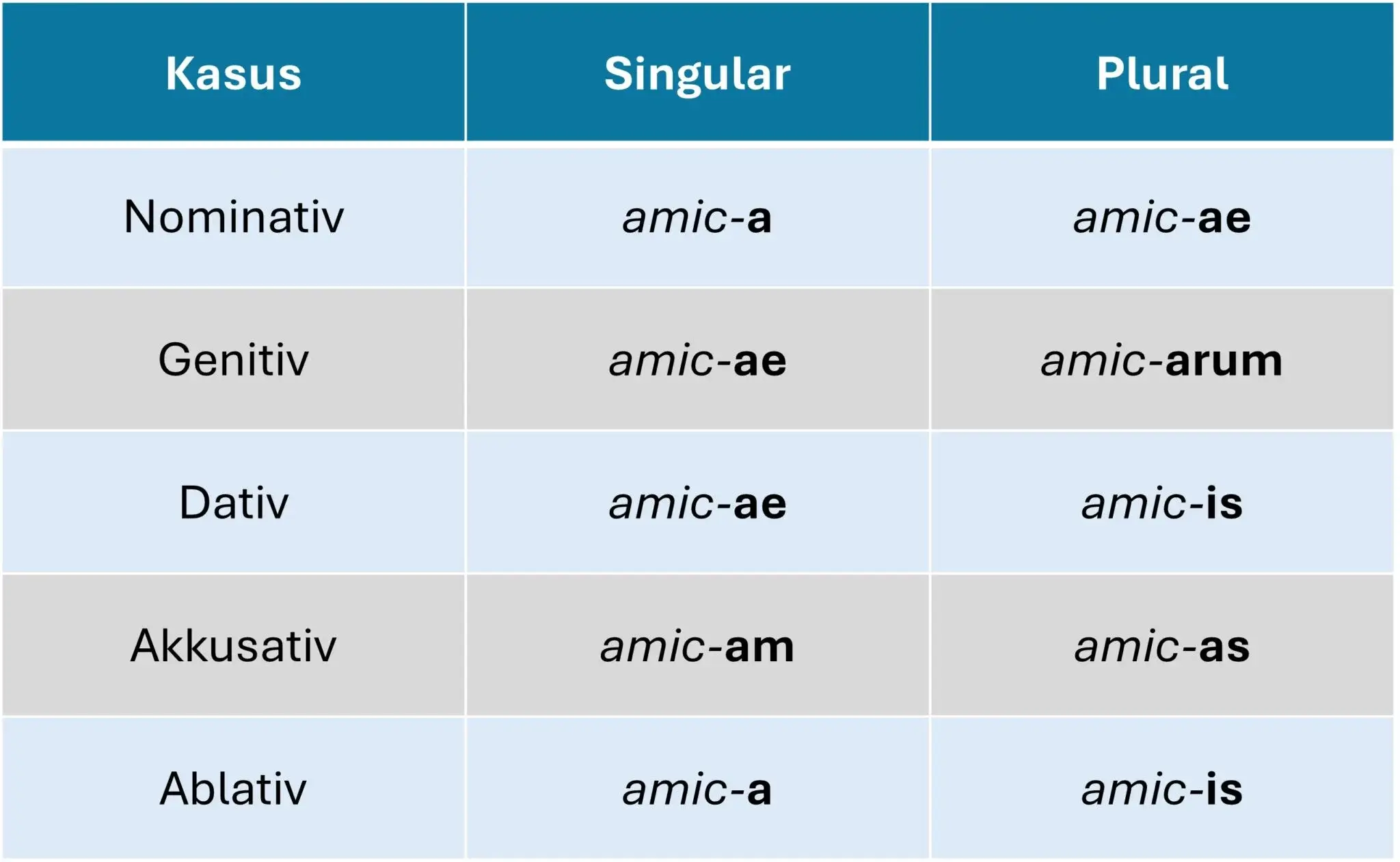 In dieser Tabelle siehst du die Endungen für alle Kasus (“amica” – die Freundin):