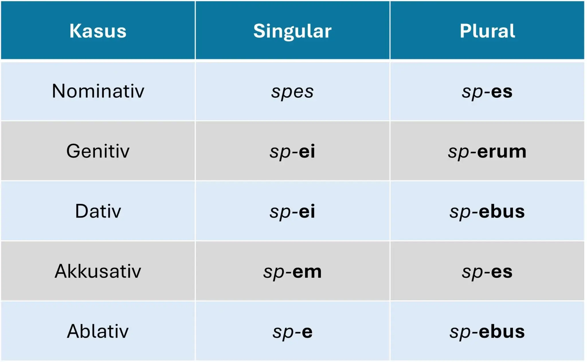 In dieser Deklination findest du vor allem feminine Substantive, die in Latein im Nominativ Singular auf “-es” und im Genitiv Singular auf “-ei” enden (Beispiel: “spes” – die Hoffnung):