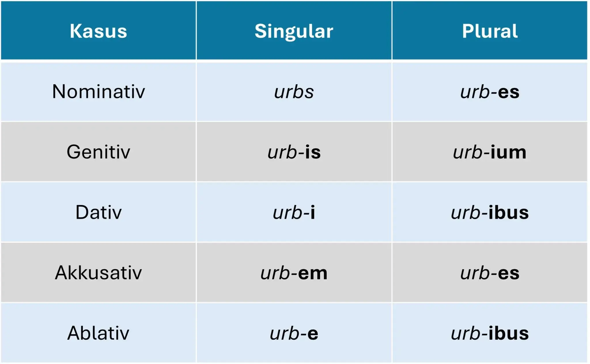 Die Endung im Genitiv Plural entspricht der Endung der i-Deklination, alle anderen Endungen gleichen der konsonantischen Deklination (Beispiel: “urbs” – die Stadt):