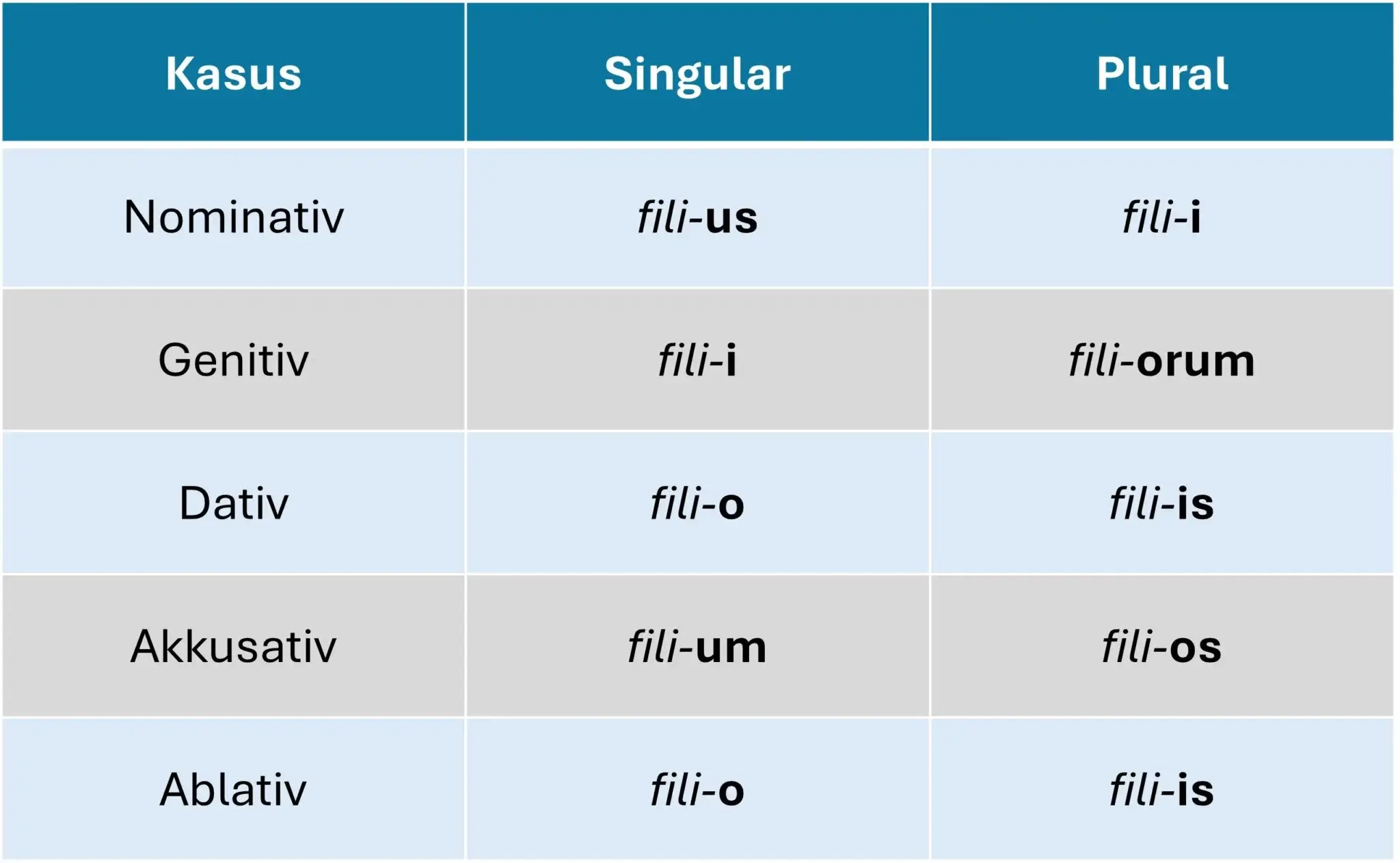 So sieht die Deklination in Latein von maskulinen Substantiven dieser Gruppe aus (Beispiel: “filius” – der Sohn):