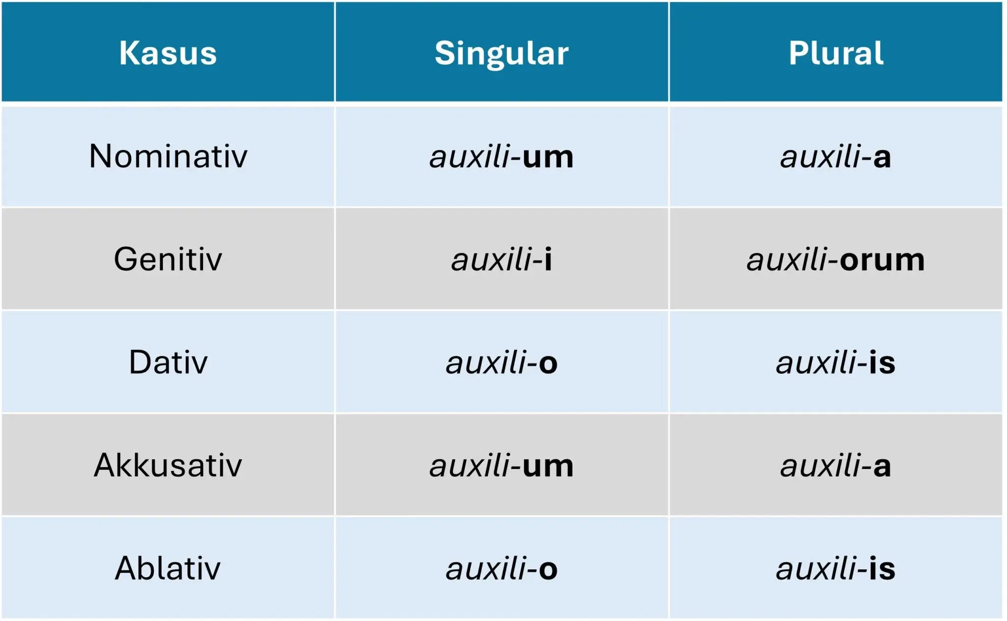Und das sind die Endungen der o-Deklination für sächliche Substantive (Beispiel: “auxilium” – die Hilfe):