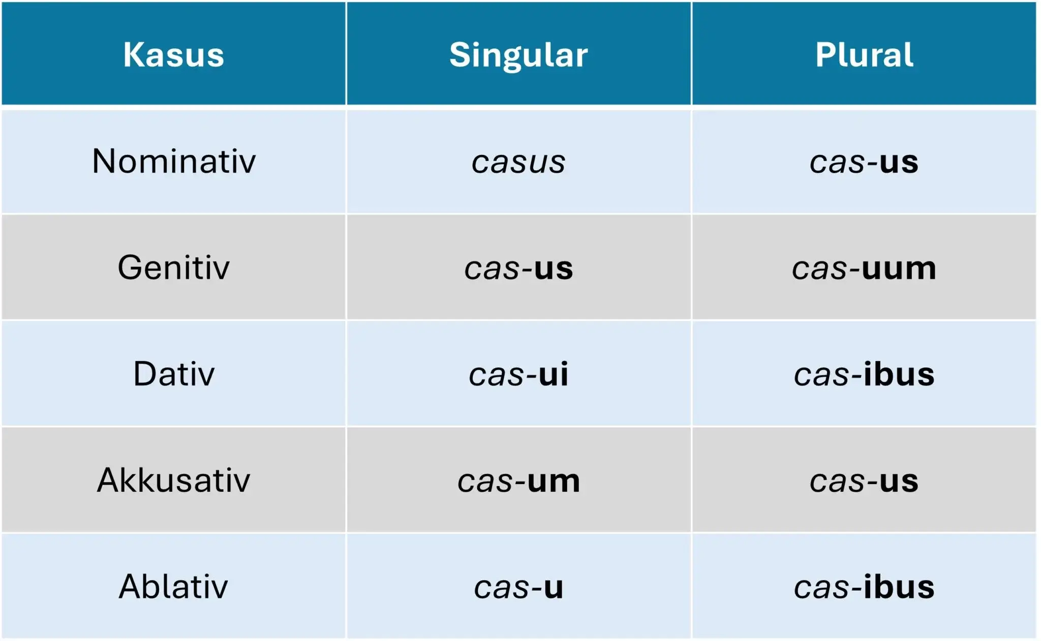 - Der Kasus (Fall) drückt eine bestimmte Funktion aus. Zusätzlich zu den bekannten vier Fällen gibt es außerdem noch den Ablativ in Latein: