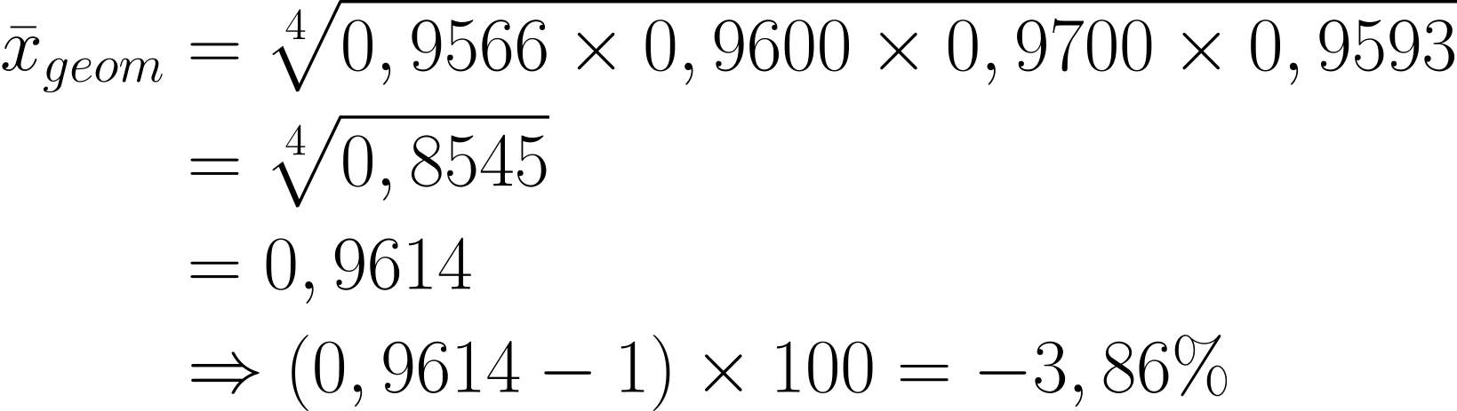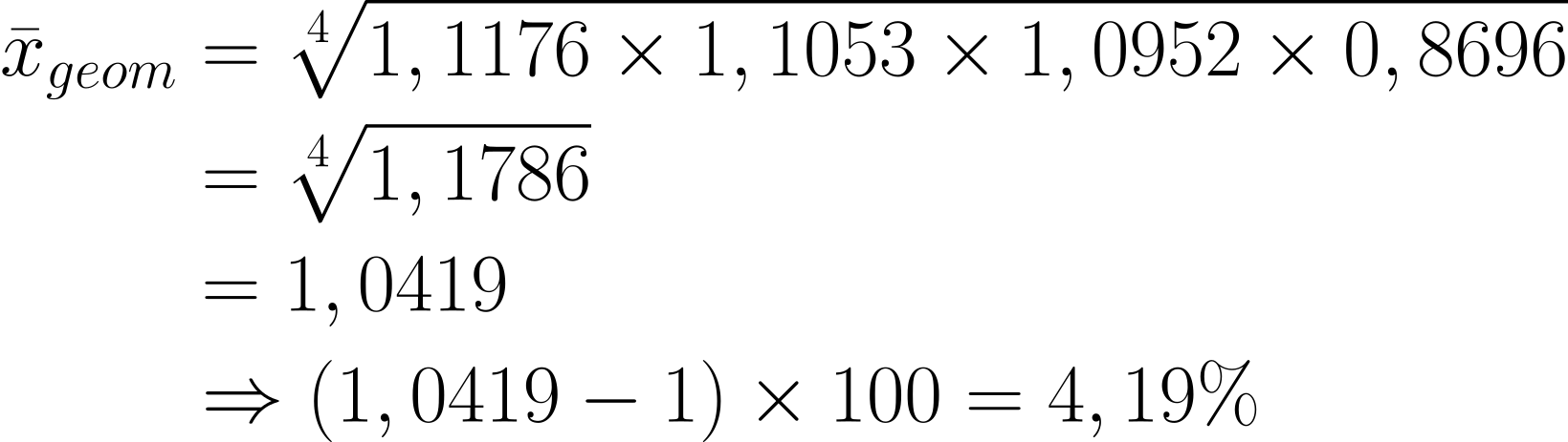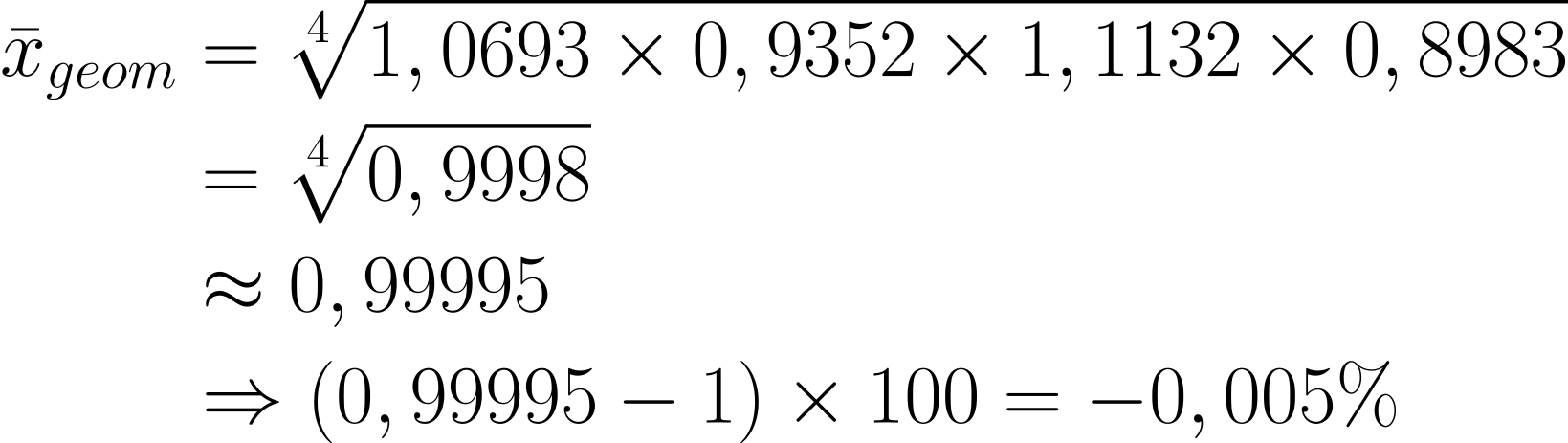 . Wir setzen die Werte in die Formeln ein: ![Rendered by QuickLaTeX.com \bar{x}_{geom} = \sqrt[4]{\prod_{i=1}^{4} x_i} = \sqrt[4]{1,1875 \cdot 1,0789 \cdot 0,9024 \cdot 1,1351}](https://www.nachhilfe-team.net/lernen-leicht-gemacht/wp-content/ql-cache/quicklatex.com-6240434ddc75da8daa06657a50fe0d9f_l3.png)