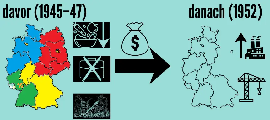 Zwischen 1948 und 1952 stellten die USA rund 13 Milliarden US-Dollar bereit. Das Geld sollte helfen, Industrie, Landwirtschaft und Handel wieder in Gang zu bringen.