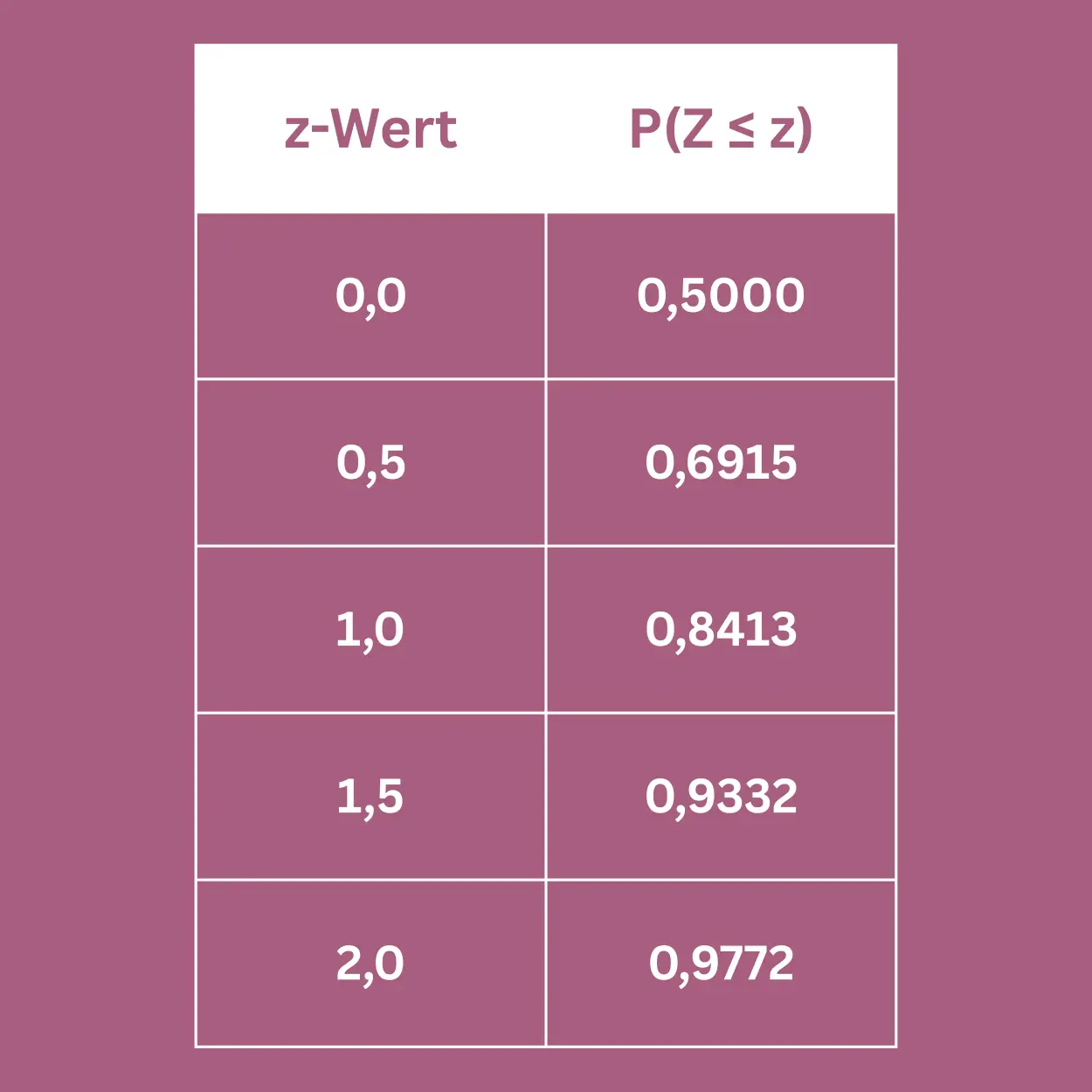 Sie zeigt, wie viele Standardabweichungen ein Wert vom Mittelwert entfernt ist. Dieser standardisierte Wert lässt sich anschließend nutzen, um Wahrscheinlichkeiten aus der Z-Tabelle abzulesen.