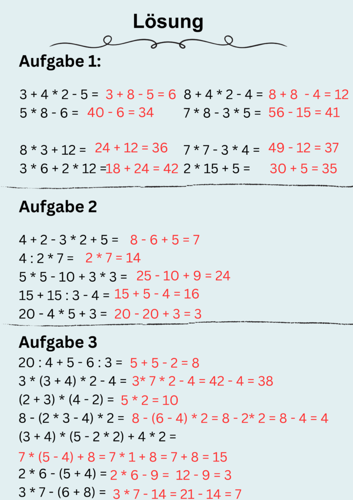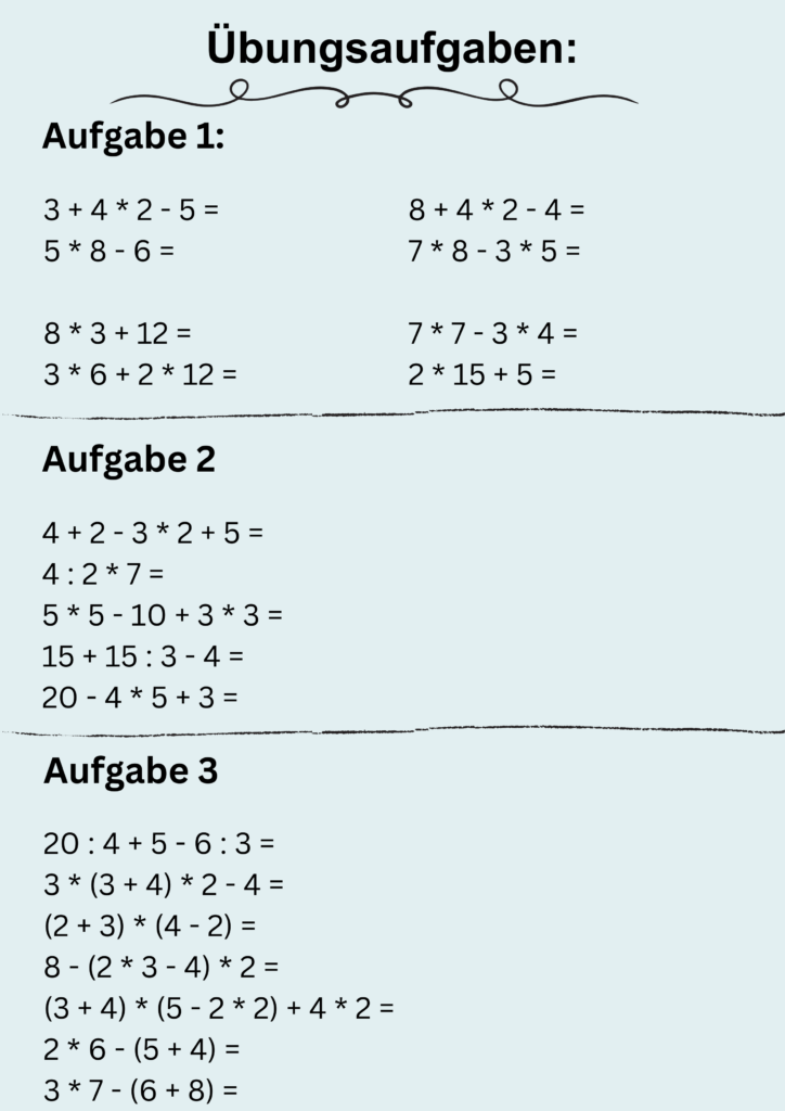 Zuerst werden die Terme berechnet, die innerhalb der Klammer stehen, danach multipliziert oder dividiert man und zum Schluss folgt die Addition und die Subtraktion.