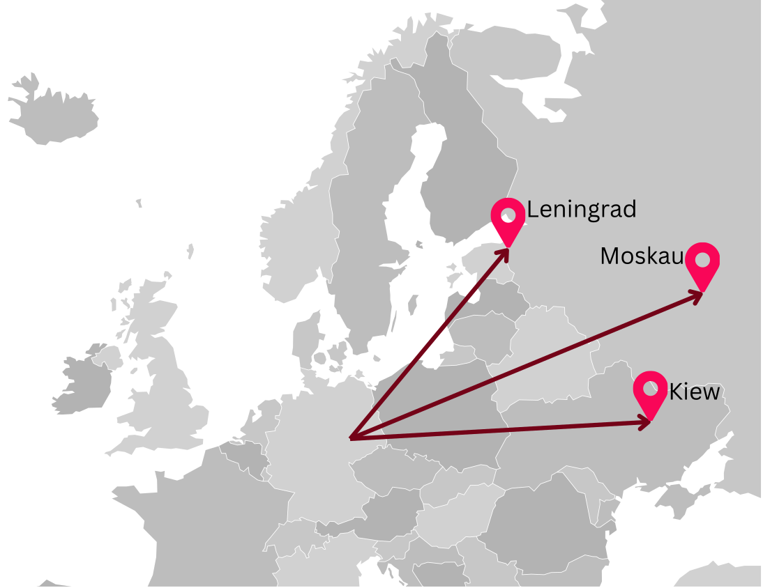 Währenddessen wurde im Norden die Stadt Leningrad eingekesselt. Die Belagerung dauerte fast 900 Tage (1941–1944) und forderte über eine Million zivile Opfer. Hunger, Kälte und Bombenangriffe prägten das Leben der Menschen.
